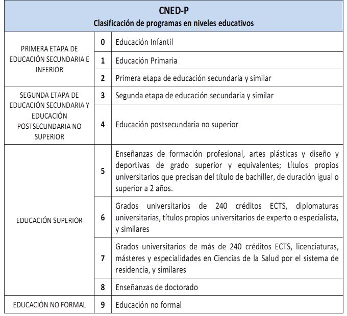 CNED-A: Clasificación de programas, titulaciones y certificaciones en niveles de formación alcanzados