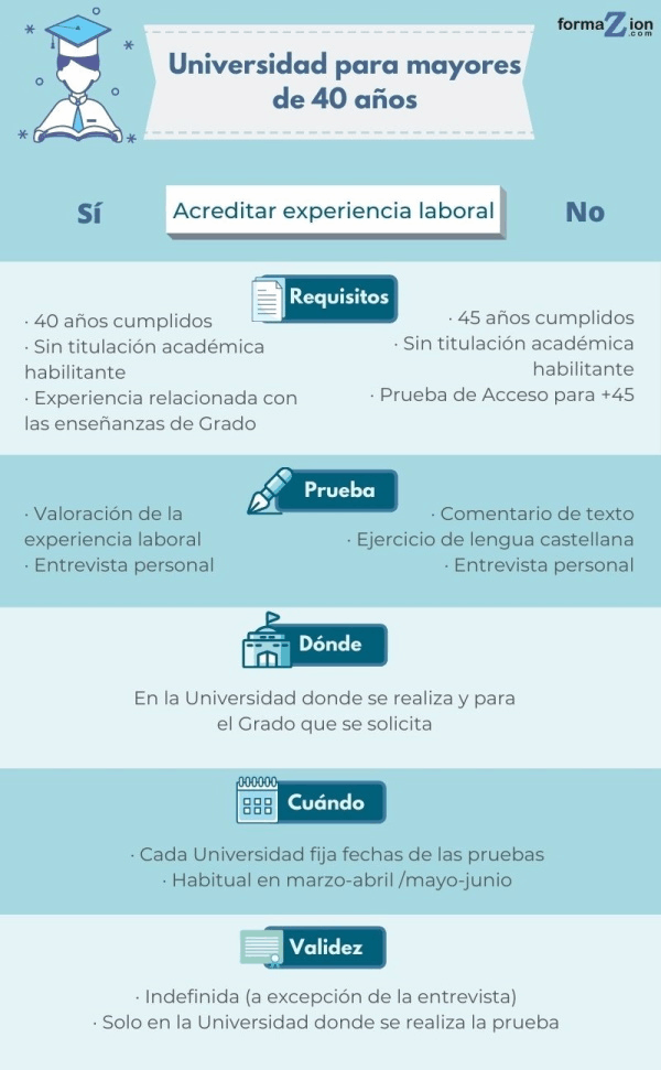 Aquellas personas que no tengan ninguna titulación académica habilitante para acceder a la universidad por otras vías, que tengan cumplidos los 40 años de edad en el año natural del comienzo del curso, y que puedan acreditar su experiencia laboral, tienen la opción de realizar estudios universitarios de Grado a través de este procedimiento. En este caso, los estudios que desee cursar deben estar relacionados con su experiencia.