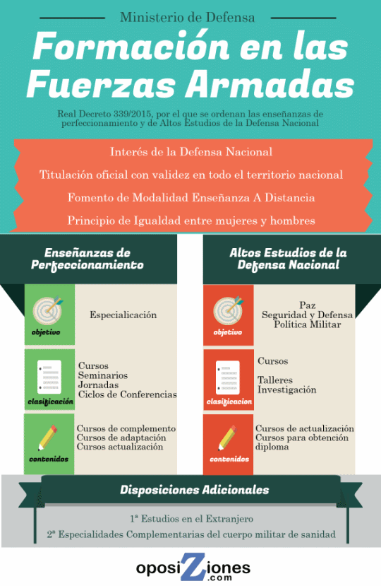 El Real Decreto 339/2015 conjuga la actividad del Ministerio de Defensa y el Ministerio de Educación, Cultura y Deporte, ya que cita en su artículo 5.5 que "El Ministerio de Defensa promoverá con el MECD las medidas necesarias que permitan: a) La autorización para impartir las enseñanzas de la formación profesional del sistema educativo general de los centros docentes militares. b) El reconocimiento oficial de las titulaciones militares. c) La autorización para impartir módulos profesionales de ciclos formativos de formación profesional en oferta parcial."