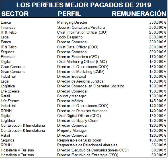 También reciben remuneraciones que rondan los 250.000 - 200.000 euros brutos anuales perfiles como el Chief Information Officer (CIO, en sus siglas en inglés, dentro del sector IT&TELCO), el Socio de Despacho (en Legal), el Chief Data Officer (CDO, en IT&TELCO) y los Directores Comerciales tanto del sector bancario como del asegurador.
